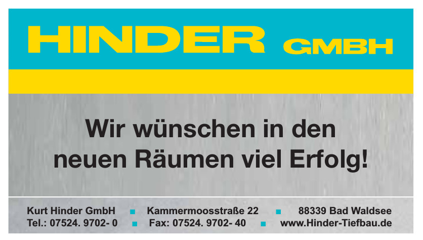 Kurt hinder gmbh kammermoosstraße 22 88339 bad waldsee. Während der öffnungszeiten hilft man ihnen dort gerne weiter. Seit der firmengründung im jahr 1970 ist das von gerda und kurt hinder aufgebaute familienunternehmen kontinuierlich gewachsen und wird mittlerweile gemeinsam von kurt und marc hinder, als vertreter der zweiten generation, geleitet.